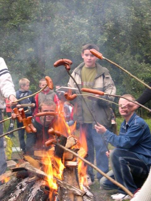 Wbrew pogodzie mieliśmy jednak dobre humory, uczyliśmy się jak kierować ruchem, sprawnie posługując się chorągiewkami (dobrze, że były to tylko mało uczęszczane drogi), śpiewaliśmy naszą turystyczną piosenkę i obserwowaliśmy jak radzą sobie z głodem nasi współrajdowicze z innych szkół. Na duchu podtrzymywała nas pani pedagog, a o naszą kondycję dbał pan wuefista. Dziewczynki chodziły nalewo, chłopcy na prawo, żeby przypadkiem nie doszło do jakiejś kolizji, a później nawet i skutków ubocznych.