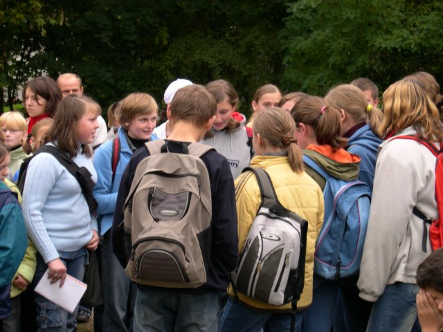 Był piątek 1 października. 7 30 mieliśmy wyjechać do Zwolenia, hmm... mieliśmy, bo nie wyjechaliśmy i, mało tego, wszystkie znaki na niebie i ziemi wskazywały, że nie wyjedziemy przed 8 00. Dziwnym trafem okazało się znów, że autokar, który miał przywieźć część uczestników rajdu nieco wcześniej, w ogóle po nich nie wyjechał. Cóż, spóźniliśmy się w ubiegłym roku, to i spóźnimy się teraz - pomyślałem. W końcu czymś musimy się wyróżniać, nieprawdaż? Myśleliśmy, że chociaż wyjdzie słońce i nie będzie trzeba zakładać deszczówki, ale pogoda też jakoś nie chciała się wyklarować, choć podobno ona "zawsze jest". Tak więc, w opadającej mgle, przy szarym niebie, jechaliśmy nieco "stłoczeni" do Zwolenia, skąd mieliśmy wyruszyć na rajd szlakami Jana Kochanowskiego. Niestety, okazało się, że mimo wysiłków pana kierowcy nasz autokar nie był w stanie osiągnąć maksymalnej prędkości (to jakieś 50 km/h) i na placu przed zwoleńską szkołą zostaliśmy sami. Ale co tam, skoro wszyscy już wyszli, to trzeba ich dogonić na trasie. Jakby na to nie patrzeć, to jest rajd pieszy i musimy iść na własnych nogach.