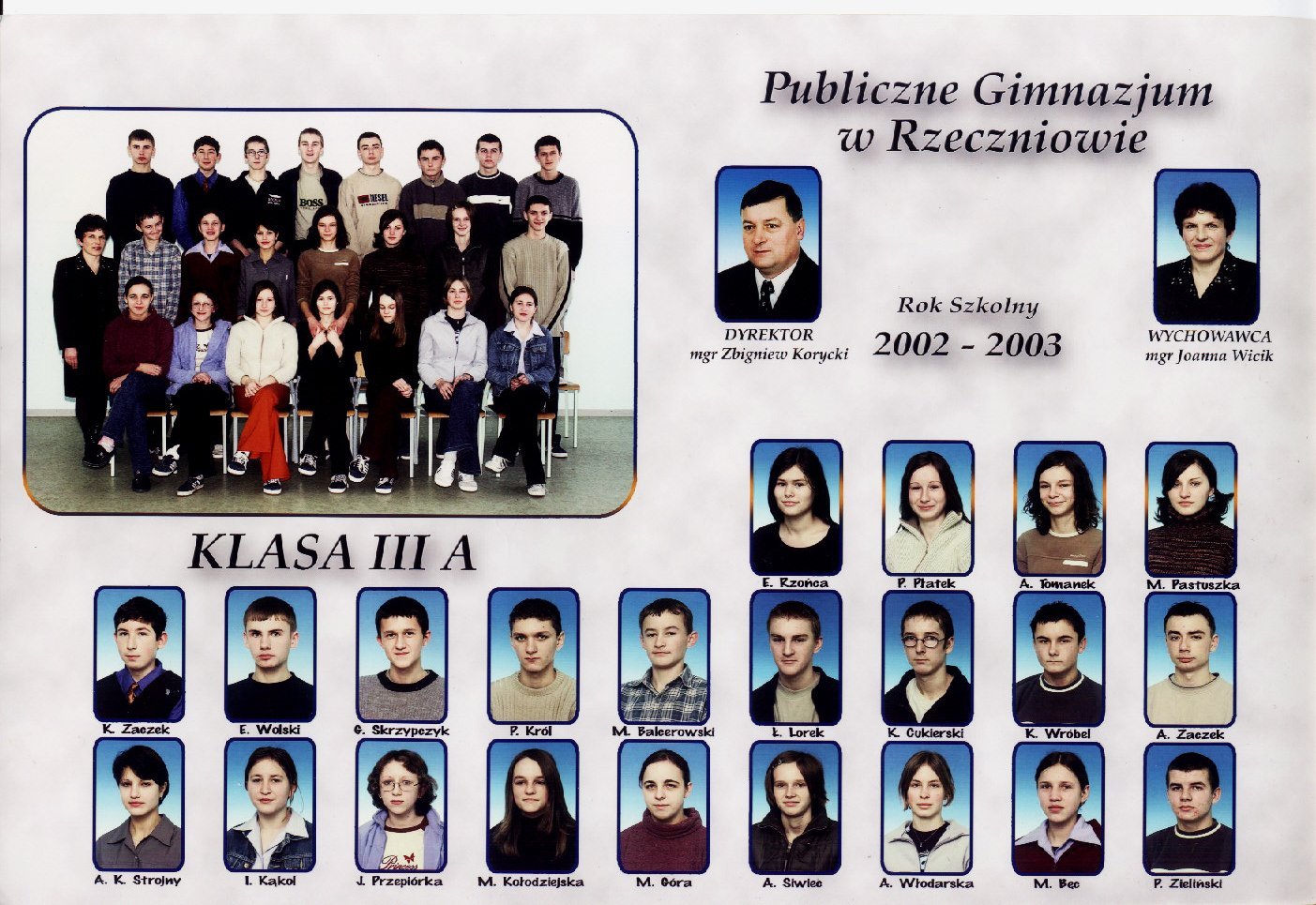 Chodzimy do Publicznego Gimnazjum w Rzeczniowie. Obecnie w szkole jest 2 klasy trzecie, 3 drugie i 3 pierwsze. W budynku szkolnym jest dobrze wyposażona pracownia komputerowa z dostępem do internetu. Na początku tego roku szkolnego odbyło się otwarcie sali gimnastycznej. Choć nasza szkoła na zdjęciu wygląda bardzo niepozornie, to w środku mają czasami miejsce "niesamowite akcje". Nasz pan od informatyki ma nadzieję, że strona ta nie trafi (przed końcem roku) w ręce naszej pani od polskiego. My wręcz przeciwnie chciałybyśmy aby jak najwięcej osób mogło dowiedzieć się jak wygląda i jaka atmosfera panuje w naszej szkole. Może kiedyś dostaniemy Pokojową Nagrodę Nobla za pomoc w rektutacji uczniów?