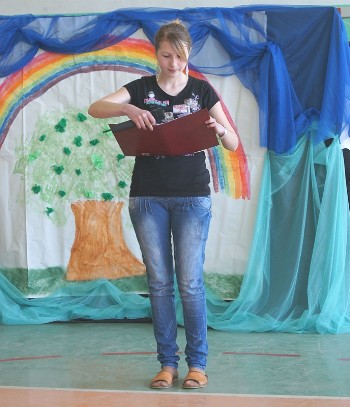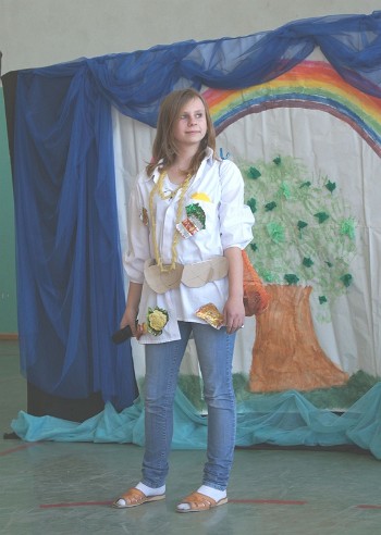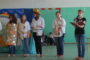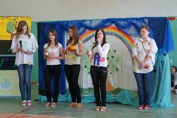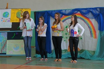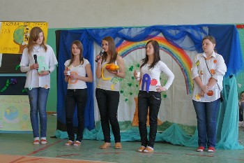 19 kwietnia 2011 roku we wtorek wszystkie klasy zaprezentowały krótkie scenki na tematy poświęcone naszej Niebieskiej Planecie, omówili główne zanieczyszczenia i mechanizmy ich szkodliwego działania oraz pokazali modę inspirowaną witaminami niezbędnymi dla prawidłowego rozwoju człowieka. Nasza klasa przypomniała wszystkim jak ważne są witaminy, które w jakich produktach się znajdują i jakie mają zadania. Oto kilka zdjęć z tej scenki: