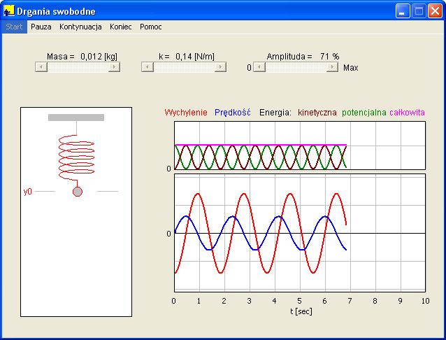 Program pozwala śledzić ruch masy zawieszonej na nieważkiej sprężynie w zależności od jej współczynnika sprężystości k, masy m zawieszonej na sprężynie i od amplitudy ruchu A. Wartości tych parametrów można zmieniać za pomocą suwaków. Na dwóch wykresach umieszczonych po prawej stronie wykreślane są zależności czasowe wychylenia y(t), prędkości v(t) oraz energii kinetycznej i potencjalnej. Polecenie Pauza z menu programu, pozwala zatrzymać program i odczytać (w danej chwili) te wartości. Polecenie Kontynuacja pozwala na dalsze wykonywanie programu.