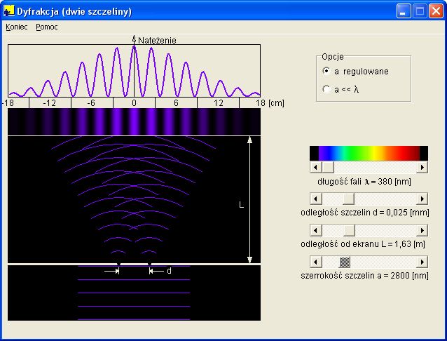 W programie można za pomocą odpowiednich suwaków zmieniać szerokość szczelin a, ich wzajemną odległość d, odległość szczelin od ekranu L oraz długość fali l i obserwować jak obraz dyfrakcyjny zależy od tych parametrów.