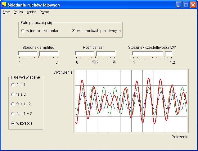 Nakładające się fale mogą poruszać się w tym samym i w przeciwnych kierunkach. Można zmieniać stosunek amplitud, przesunięcie fazowe, stosunek częstotliwości. Wykres wychylenia od położenia pozwla wyświetlać pojedyńcze fale, obie fale jednocześnie, sumy wychyleń jak również wszystko.