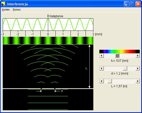 Program pozwala obserwować wynik interferencji dwóch spójnych fal świetlnych powstałych w wyniku przejścia płaskiej fali świetlnej przez przesłonę z dwoma punktowymi szczelinami (doświadczenie Younga).
