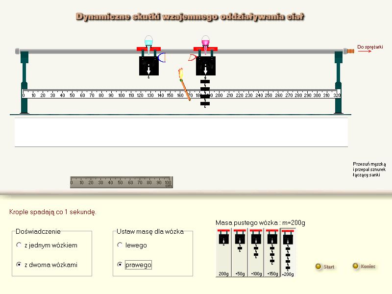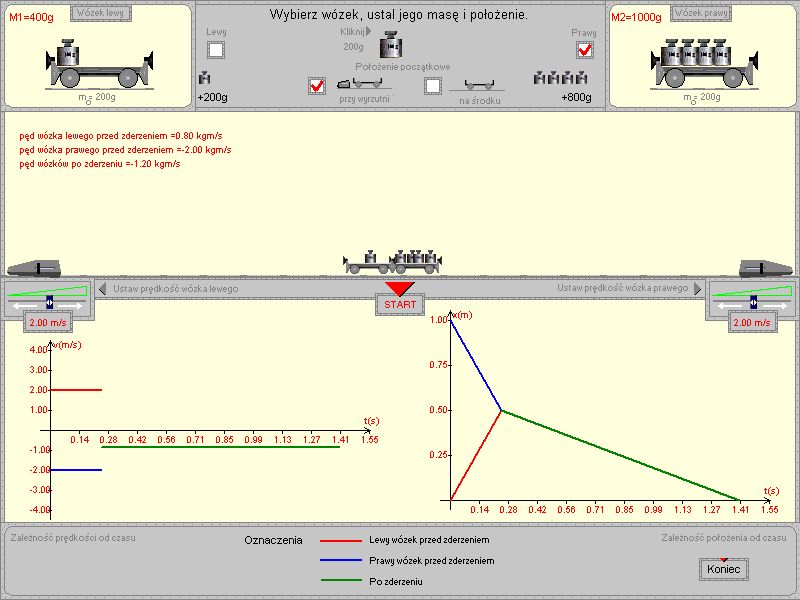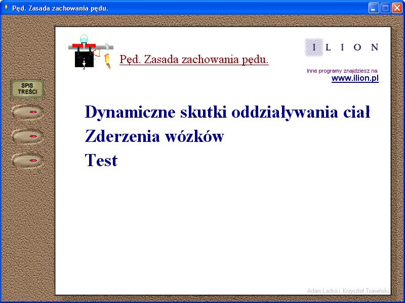 Program ilustruje zasaę zachoeania pędu. Pozwala wyknywać doświadczenia z oddziaływaniem wózków na torze powietrznym, oraz zderzanie wózków. Masę wózków można zmieniać. Na koniec prosty test sprawdzający wiedzę.