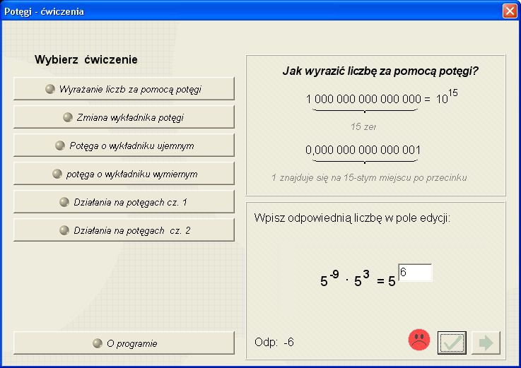 Program do nauki potęg o podstawie 10 i wykładniku wymiernym i ujemnym oraz sprawdzania swojej wiedzy.
