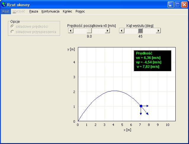 Program pozwala śledzić w trakcie ruchu prędkość chwilową oraz jej składowe: vx (składowa pozioma) i vy (składowa pionowa). Można także, zmieniając opcję, obserwować przyspieszenie i jego składowe: an (składowa normalna do toru, odpowiedzialna za zmianę kierunku prędkości) oraz as (składowa styczna związana ze zmianą wartości prędkości). Odpowiednie wartości chwilowe prędkości lub przyspieszenia są wyświetlane w okienku na wykresie.