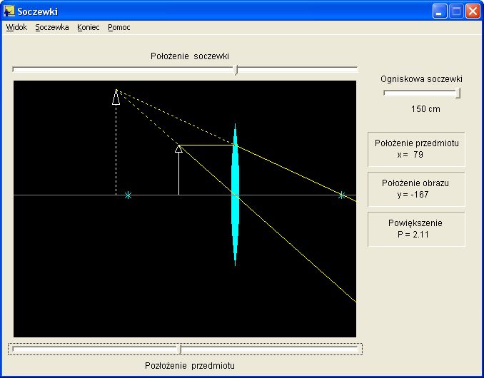 Program pozwala obserwować obraz w soczewce skupiajacej i rozpraszającej w zależności od ogniskowej i odleglości przedmiotu od soczewki.