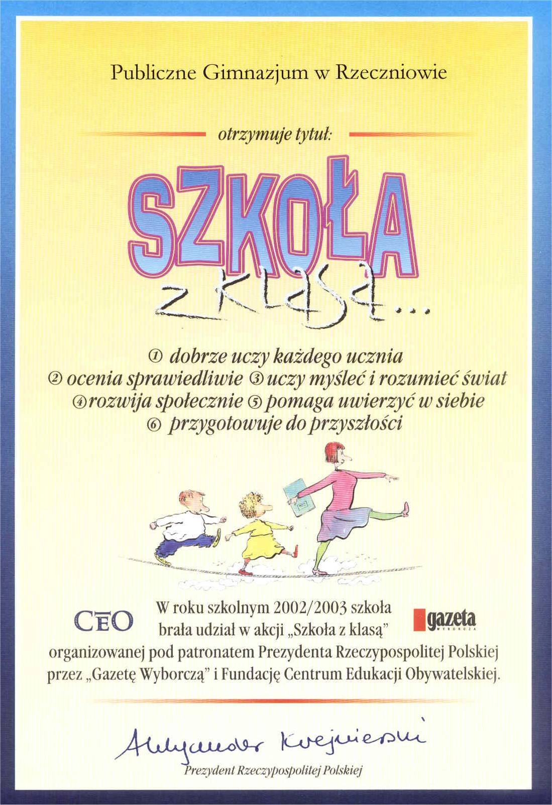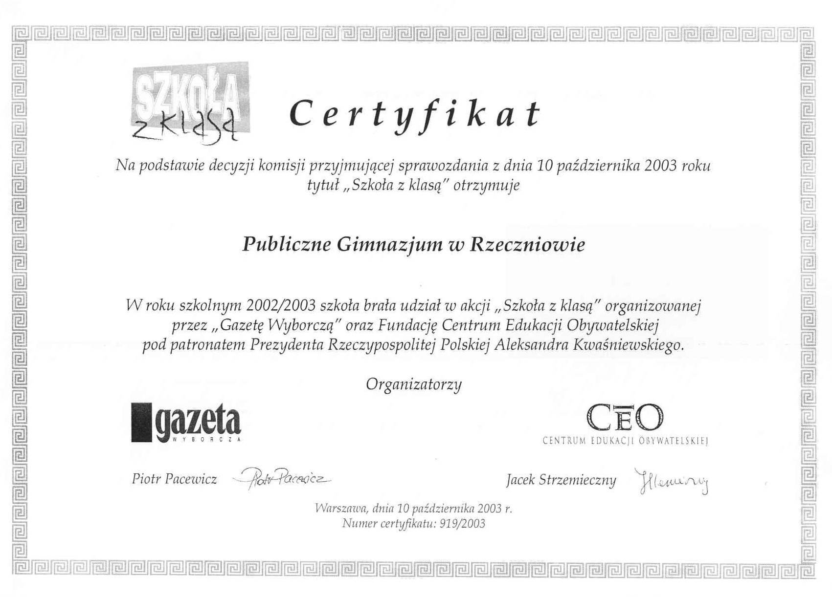 W roku szkolnym 2002/2003 Publiczne Gimnazjum w Rzeczniowie oraz Publiczna Szkoła Podstawowa w Rzeczniowie z powodzeniem wykonały zadania stawiane przez organizatorów: Gazetę wyborczą CENTRUM EDUKACJI OBYWATELSKIEJ.